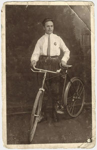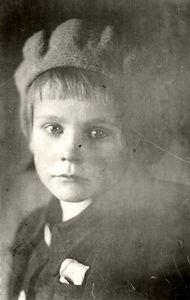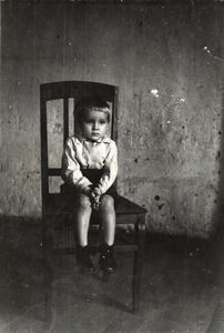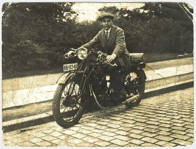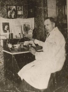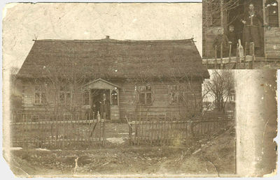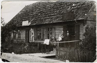 1931-ieji. Mosėdis. Prie gimtųjų namų motinos rankose – mano tėtis ir šalia jo transporto priemonė. Ant stogo dvi reklaminės iškabos: „Fotografija“ bei (atsarginis biznelis) „Alkoholinių gėrimų parduotuvė“