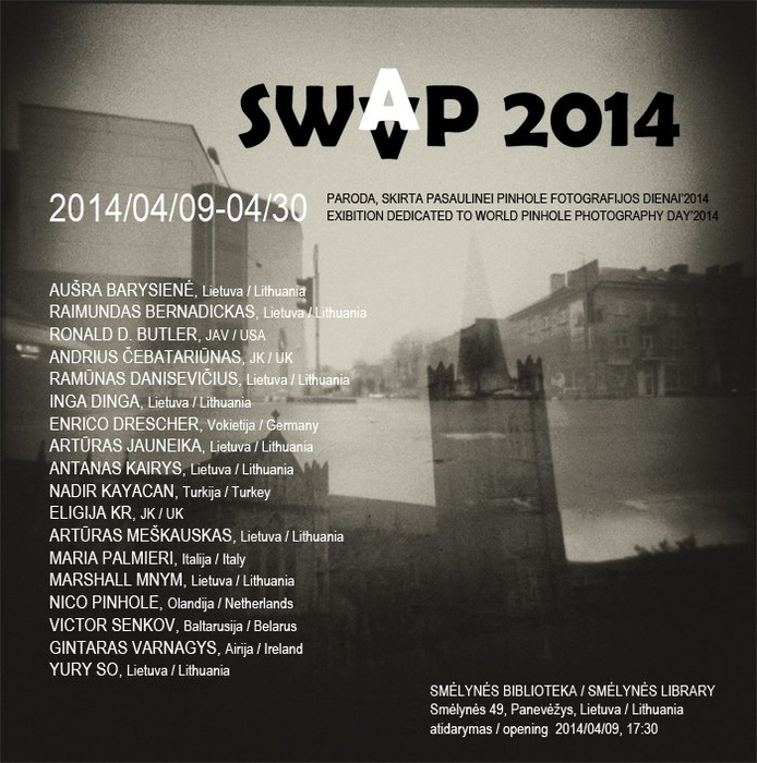 paroda skirta pasaulinei pinhole fotografijos dienai (2014-04-27). SWAP 2014 tai mainai tarp įvairių šalių pinhole mylėtojų, kai išfotografuota juostelė siunčiama kitam žmogui, kuris ant viršaus daro antrą ekspoziciją kurdamas persipynusių atvaizdų šventę. Parodos atidarymas 2014 04 09 dieną 17 val. 30 min. Panevėžyje Smėlynės g. 49, bibliotekoje Smėlynė. Paroda vyks iki balandžio 30 dienos. Kviečiame !