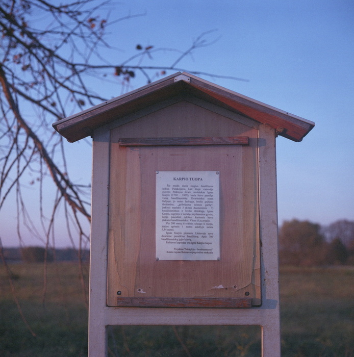 Šalia medžio stovi užrašas: