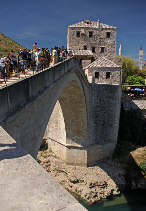 Tas žmogus šoka nuo Mostaro senojo tilto Tiltas Bosnijoj, nutiestas per Neretvos upę, jis istorinis, pats Mostaro miestas pavadintas pagal jį. Aukštis nuo upės paviršiaus 25 metrai, bet nuo viršaus žiūrint tai visai neatrodo mažai. :)  Miestas turistinis - jo aplankymas galimas įvairiose kelionėse į Kroatiją, jei Jums pasiseks rinktis tokią kelionę - rekomenduoju. :) Tie žmonės, kur šokinėja nuo tilto yra vietniai. Buvau Mostare du kartus, nė karto nemačiau šokinėjant turistų.