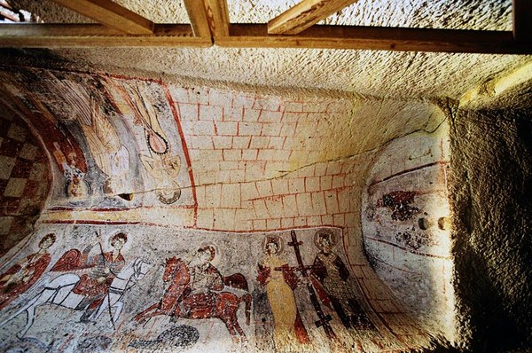 Vėliau į tas uolienas įsikasė pirmiejį krikščionys, slėpdamiesi nuo persekiojimų. Ne tik įsikasė, bet įkasė ir dievą - t.y. uolose iškirto didžiules patalpas, skliautus, nutapė freskų ir gavosi bažnyčios.
