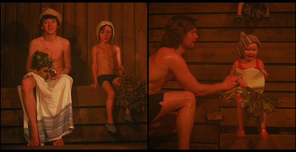 Mažosios pirtinimosi laikas – 3 minutės, 24 sekundės. Laiką teko stabdyti, mat nugalėjo ilgesys mamytei:) Patyręs pirties lankytojas Nojus kaitinosi 10 min. 40 sek.