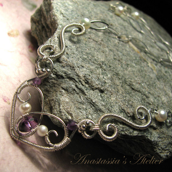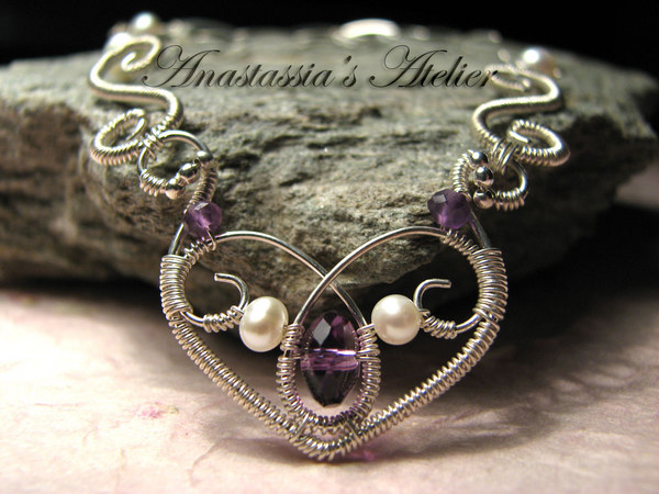 Pagrindinė papuošalo dalis kruopščiai apvyniota smulkute sidabro vielute, viduryje – ametisto akmenukas, iš abiejų pusių papuoštas žvilgančiais upiniais perlais. Kiek aukščiau, papuošalas dekoruotas mažyčiais sidabriniais karoliukais, bei ametistais. Prie įmantrios sidabrinės grandinėlės jungia dvi kruopščiai apvyniotos banguotos dalelės. Užsegimas papuoštas perlais.