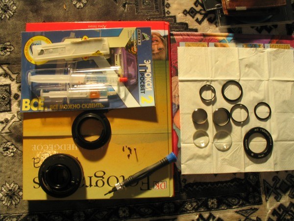 tada meniską (didijį, į tą pačią pusę išgaubtą stikliuką iš išardyto bloko) bandom statyt į jo naująją vietą. klijus naudojau dvikomponenčius stikluj