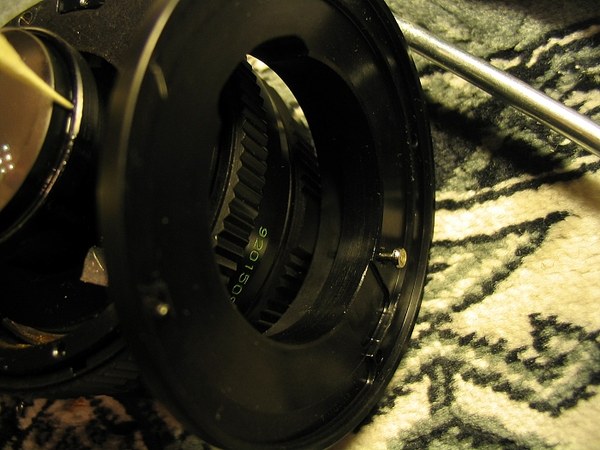 kadangi objektyvas su automatine diafragma, reik priklijuot diafragmos valdymo kojelę nuspaustoj pozicijoj, kad diafragmą būtų galima uždarinėti rankiniu būdu
