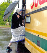 Mergina su skėčiu ant šulinio dangčio