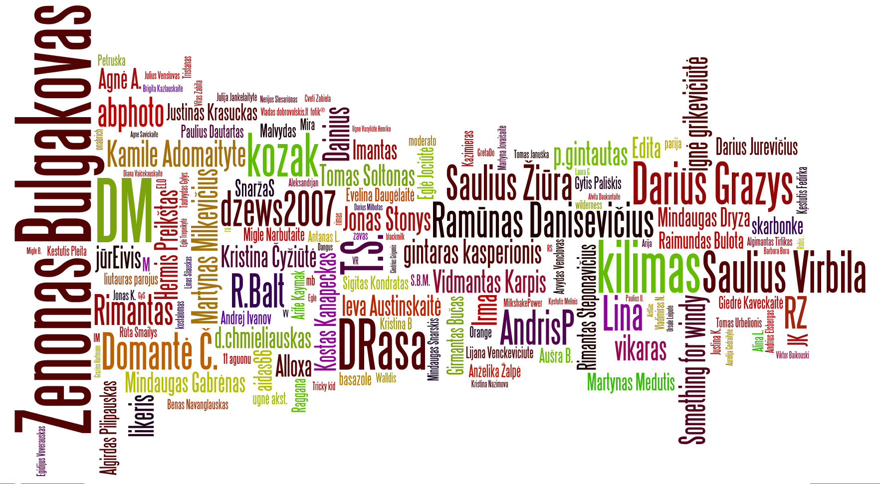 Žadėjome pasibaigus kiekvienam mėnesiui išrinkti ir vizualiai parodyti geriausius fotoKūdros fotografus. Tad susumavome balandžio mėnesio fotografijų balus pagal kiekvieną vartotoją ir gavome štai tokią vizualizaciją. Kuo didesniu šriftu yra parašytas autoriaus vardas, tuo daugiau jo fotografijos surinko balų.