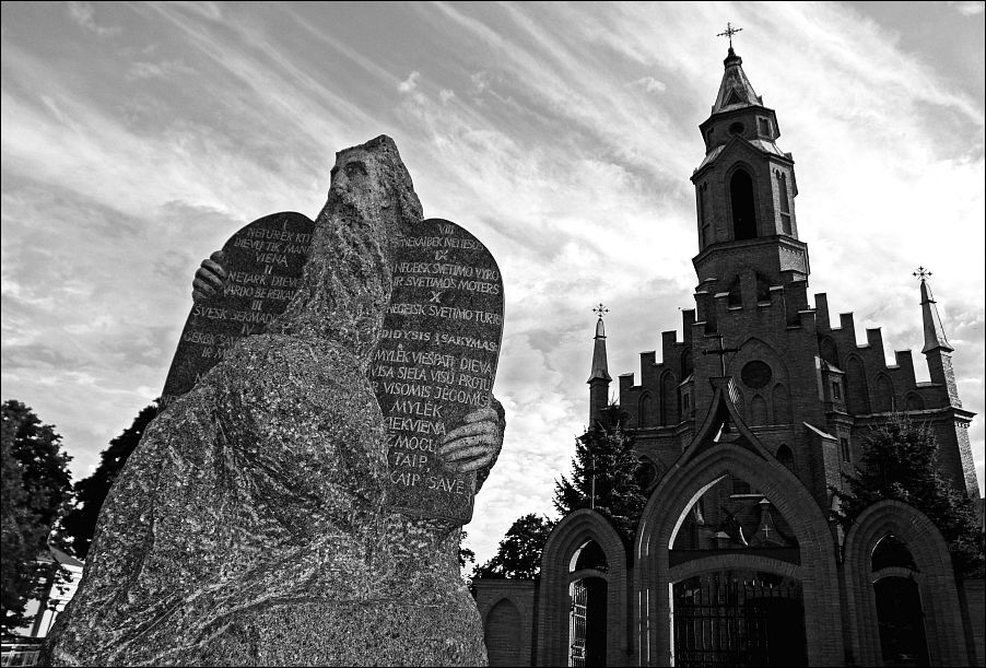 Kristei. Tai ne statula, o Mozės skulptūra :) Katalikų bažnyčia yra būtina, nes kitaip nebūtų konflikto. O konfliktas tame, kad Mozė savo tautai skelbė kitokius (tik iš pirmo žvilgsnio jie panašūs) Dievo įsakymus, nei praktikuojami katalikų bažnyčioje. Žydams Mozės įsakymai yra kitokie. Tad skulptūra priešais katalikų bažnyčią su netikrais įsakymais yra tarsi simbolis MŪSŲ TOTALAUS nesusipratimo kas mes, kur mes ir kam mes esame. Va, kaip filosofiškai :)