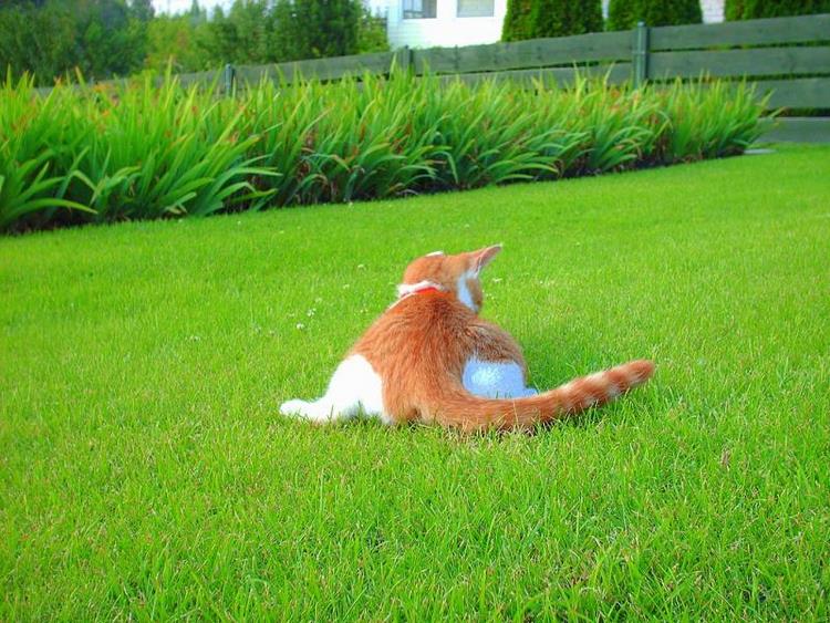 minkštas katinas ant minkštos žolės.