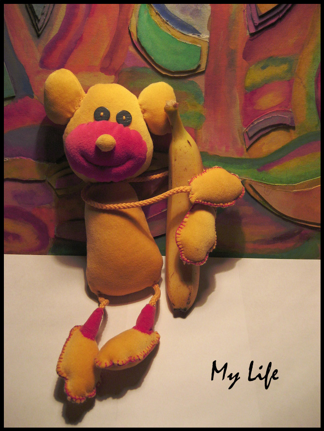 ui kaip mielai jis tą bananą apsikabinęs:) o spalvos tokios nuotaikingos ir žaismingos, vaikams turėtų labai patinkti toks žaislas