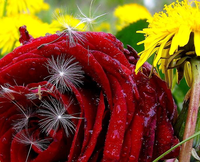 Nelabai patinka kompozicija - neaišku kas pagrindinis objektas rožė, pienė ar pūkai. O kai taip viskas krūvoje - nekabina. Bet uoga - už ryškumą ir spalvas. Ir pąstangas :)