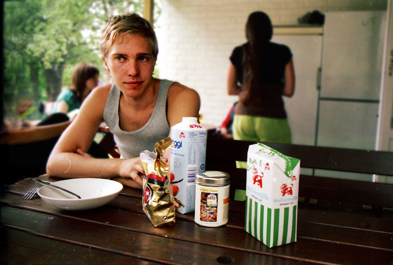 spannmål, mjölk, smörgåsar, kaffe.