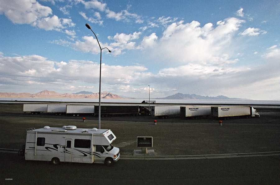 Visą naktį važiavome Interstate 80 keliu Nevados dykumomis, tiksliau Boneville Druskų Lygumomis, kur ir dabar galima išgirsti greičio rekordų siekiančių reaktyvinių automobilių riaumojimą. Kaip tik vienoje iš tokių aikštelių ir stabtelėjome jau švintant.