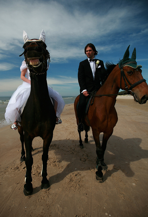 Prajuokino... užuojauta jaunikiui jei nuotakos ne tik šypsena, bet ir veidelis arkliškas...:) P.S. Gerbiu drąsius žmones, o šiuo atveju fotografas parodęs šią nuotrauką jaunąjai ir jaunikiui prie vestuvinės užstalės rizikavo būti nudobtas vienu smūgiu keturiom skylėm...:) Belieka tikėtis, kad jaunikis nors ir rūgštokos veido išraiškos, bet su dideliu jumoro jausmu...