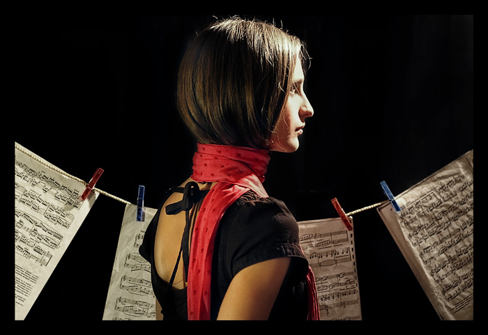 Dėmesio centras ne į veidą t.y. portretą. Dėmesys krypsta į pečius, šalį, iškirptę, lapus. Šiap labai graž spalva, šviesa, kompozicija