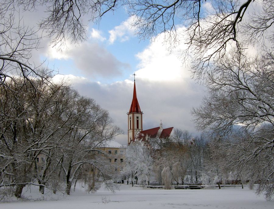 Kai aplink balta, gražiai išryškėja raudoni bažnyčios stogai...