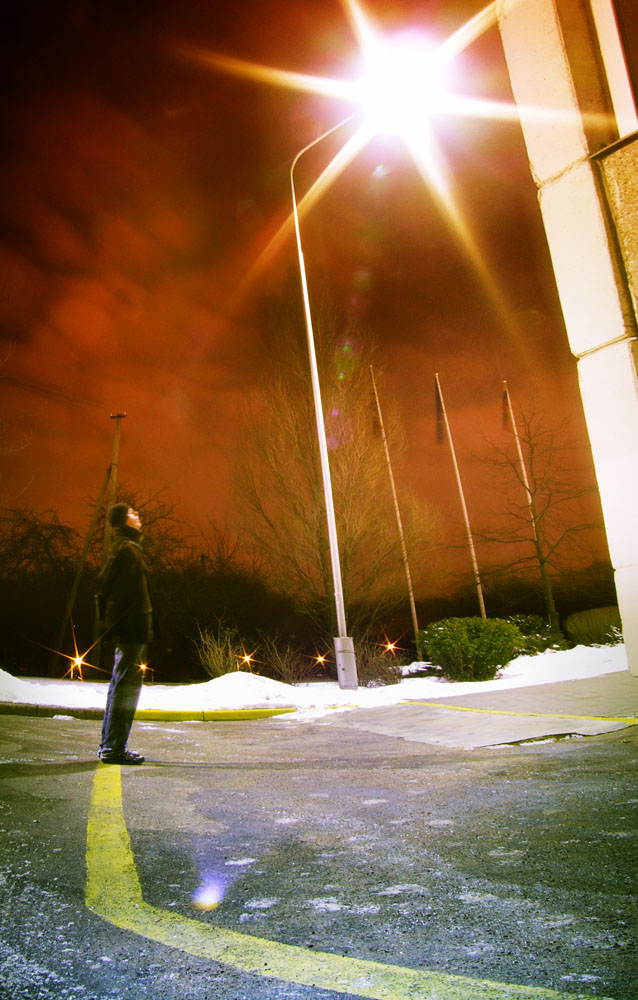 nepatiko, nes: perdaug istempta i virsu, labai jau susiliejes nuo puses zmogus,nuo tos lempos kazkokie kleckai net ir ant saligatvio "uzkrite". vat galetu nuotrauka tokia labiau tiesi but, o ne kazkokia "lenkta". ir tas asmuo galetu stoveti veidu tiesiai i lempa( ta prasme, kad vienoj linijoj( kad pats apsvietimas atsidurtu jam tiesiai virs galvos).