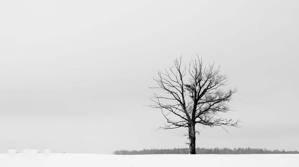 Plačiašakis medelis visame sniego baltume.