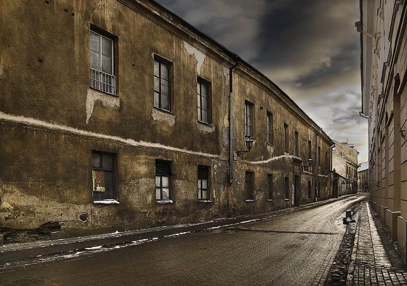 Mindaugai zinok buna toks apsvietimas. kai is vienos puses saule o is kitos tamsus debesys. tai gaunas kaip su difuzeriu isklaidyta sviesa. plius ji atsispindi nuo sviesesniu namu sienu tai apsvietimas kaip kine buna. man cia patinka spalvine gama. nepatinka kadro netikroviskumas sarpiskumas ir kad nera kokios nors raudonos moters ar kokio vaiko klausiamai ziurincio i siena. :).