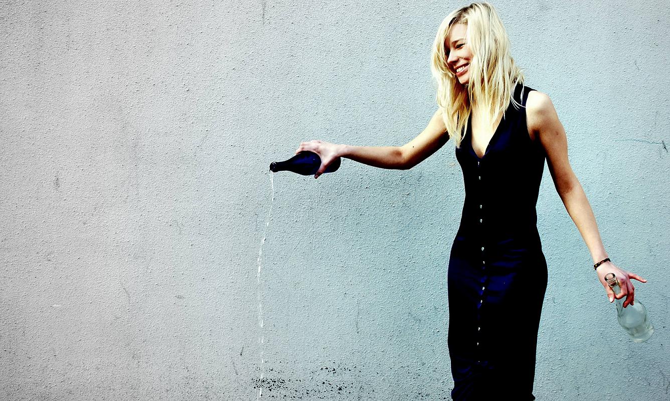 sušalusi,bet laiminga mergina su tuščiais buteliais rankose