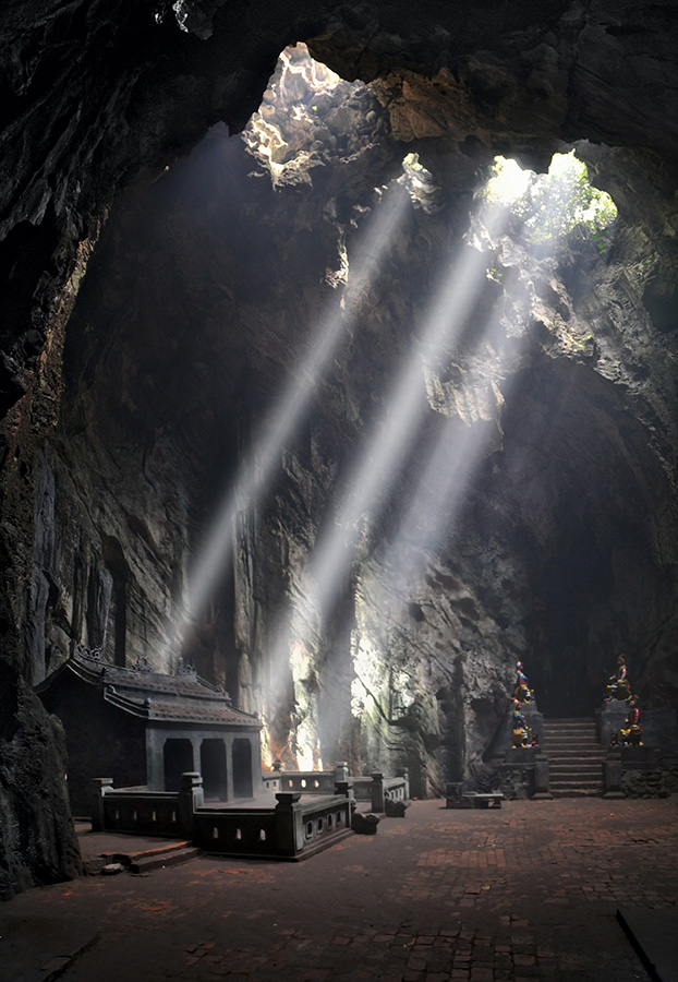 Vietnamas, šalia Da Nang-o miestelio. Ši uola su istorija: iš jos vietnamiečiai karo metu sunaikino 18 amerikiečių karo lėktuvų, stovėjusių už kelių kilometrų. Tie užpyko ir tol bombardavo šiuos kalnus, kol prakalė kelias skyles lubose, kurias jūs ir matote. Beje, rūkelis nuo smilkalų, kurių čia pridėta gausybė.