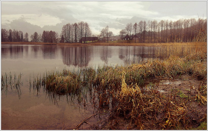 nuostabus vaizdas, kada dangus kalbasi su medžiais, krantas su atspindžiu,