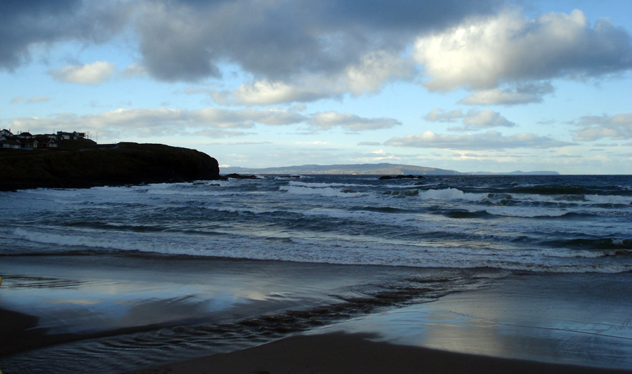 labai graži akimirka - krantą liečia "šaltos veidrodinės" bangos su debesų atspindžiais, o toluma jau apšviesta saulės... +