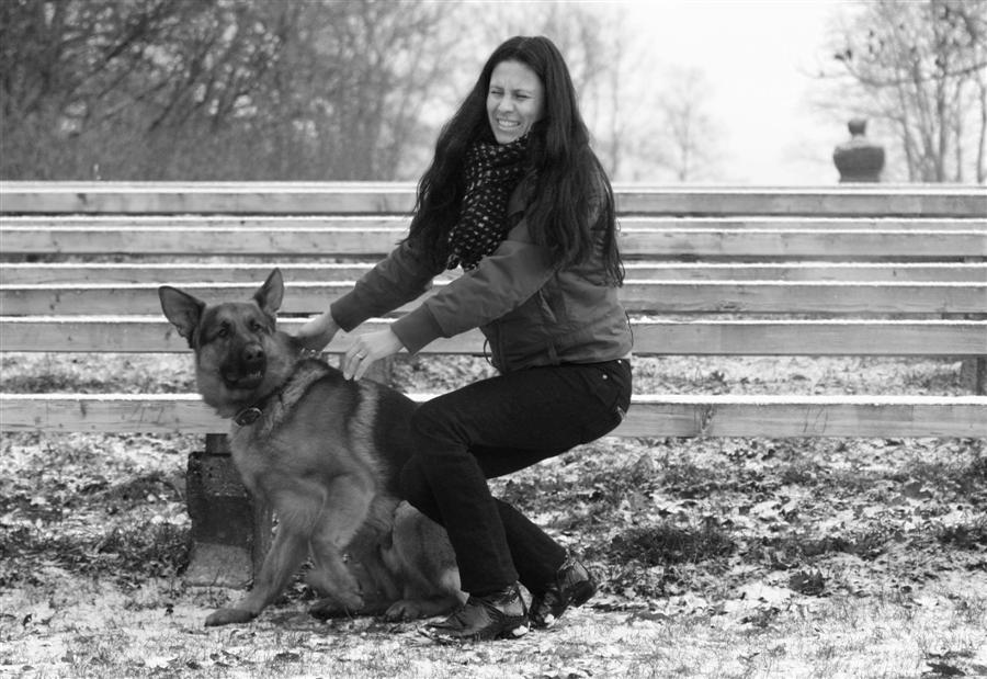 Susidaro įspūdis, kad mergina labai bijo šuns, nes liečia jį vos pirštų galiukais ir bijo išsipurvint :))