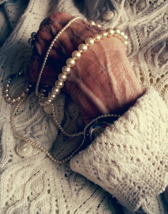 Jėtau, koks išraiškingas veidas! ir dar tie karoliai, suspausti tarp delnų... nuostabu :) norėčiau, kad manoji močiutė man pozuotų ar bent leistųsi būti forografuojama.. jei padarau bent vieną jos kadrą, ji man netgi galvą nusukt grasina :s