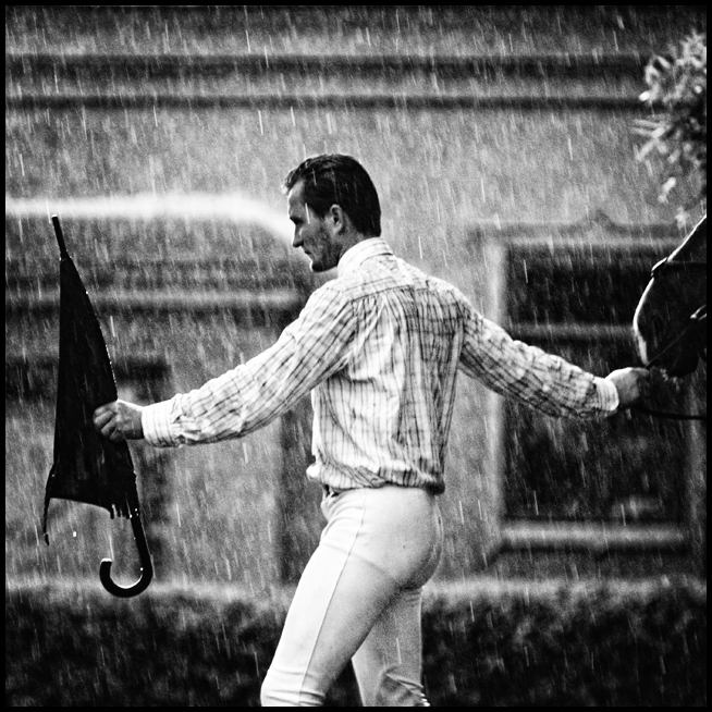 4/todel, kad cia ne zirgo portretas, o jo raitelio, netinkamai nesiojancio lietsargi per lietu! :)