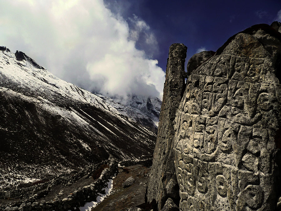 12/ Debesu neliečiau - šiek tiek patamsinau su levels ir tiek. Matomai bręsta reikalas rimtesniam monitoriaus sukalibravimui. Šita vieta yra apie 4000 m aukštyje. Tokių maldu akmenų ten išties daugybė, tad dėl jų amžiaus niekas galvos nesuka. Jei prispaudžia reikalas - ir tvarto stogelio skardą su vienu iš jų prispaudžia.
