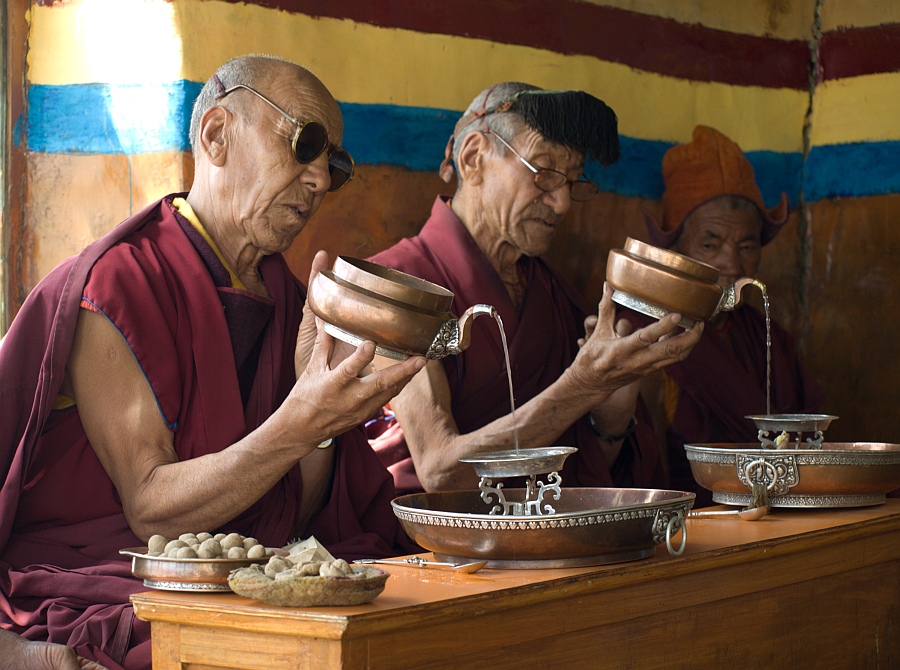 1/ Ne, čia ne arbata, vanduo. Apeigų metu vienuoliai lipdė kažkokius rutuliukus ir juos vėliau dėjo į tuos indus su vandeniu.