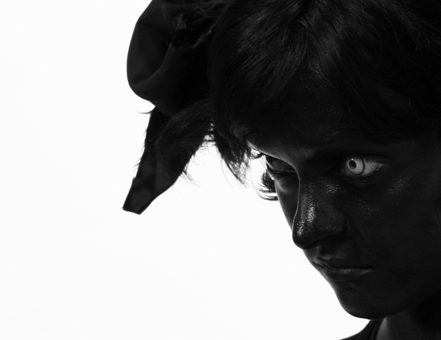 Inga - aciu uz komentara, bet nuotrauka nebuvo nei sviesinta, nei tamsinta nei dar kaip nors edituota, bandziau pasviesinti visa nuotrauka del to paties - odos fakturos ir pacio veido, bet taip tik sumazeja kontrastas tarp juodo ir balto, veidas pasidaro pilkas, ne juodas, o akys yra su lesiais, gal ten kur yra sviesus plotelis matosi tikra akis per lesi.