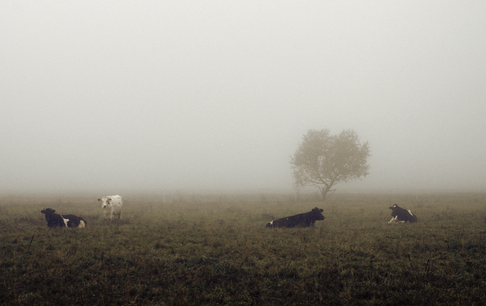 slegia slegia tas rūkas, žiūrėkit, trys karvės jau parvirtusios, viena dar laikosi ant kojų su juo ant nugaros užkritusiu, bet galva jau irgi linksta prie žemės.