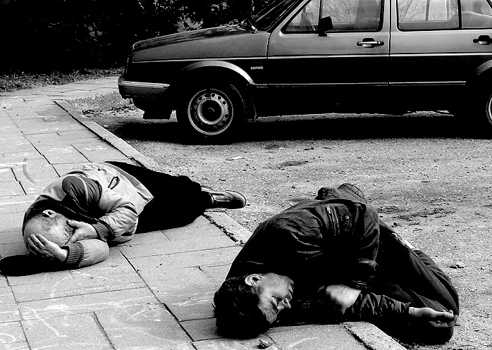 Antanai - jei galvočiau apie visokį skleidimą, fotografuočiau vaikus su balionėliais ir besiskleidžiančius žiedus parke. o čia - gyvenimas. menas yra pažvelgti į tikrovę kokia ji yra. nepagrąžintą. o šitoje nuotraukoje neestetiško irgi nieko nėra - jokio snarglio, ar pamuštos akies. tiesiog gyvenimiška situacija. be to vienas iš dviejų yra mūsų namo įžymybė, t. y. neatskiriamas. o sykį miegojo rūsio laiptinėj galva žemyn. Vakar kalbėjau ir filmavau savo draugą, menininką. gyvena vandentiekio bokšte, nes žmona iškraustė iš namų. jis kalba apie tėvą Stanislovą (pažinojo jį dar vaikas būdamas), natalevičių, varkulevičių, justiną mikutį, traklį, rilkę ir savo tetą Vladę. ir vis ptraukia iš kakliuko rašalo. baudas už viešosios tvarkos pažeidimus atpila daboklėj. o sykį gavo 25 paras už tai kad atėjo pas teisėją prašyt kad skirtų jam parų vietoje baudos, o iš paskos įlido jo šuo Čiornyj. tai už tą šunį. sakysit teisėjas - švarus, teigiamas, o mano draugas - valkata, neigiamas. bet aš sėdėjau teismo salėje, kai tas teisėjas išteisino vairuotoją (šio tėvas - didelis viršininkas), kuris būdamas girtas su mašina užmušė žmogų. tai aš turiu pagrindo nevertint žmogaus pagal aprangą, bet jeigu yra spektaklis, kodėl turiu praeit?