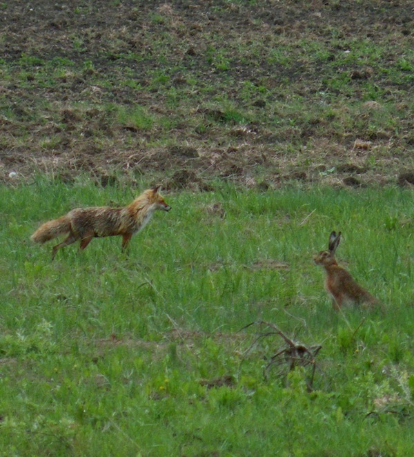 Pro šalį eidama lapė visai galvą nusuko į kitą pusę, tipo nemato, o praėjusi iš nugaros puolė, bet kiškutis pabėgo.... ;)