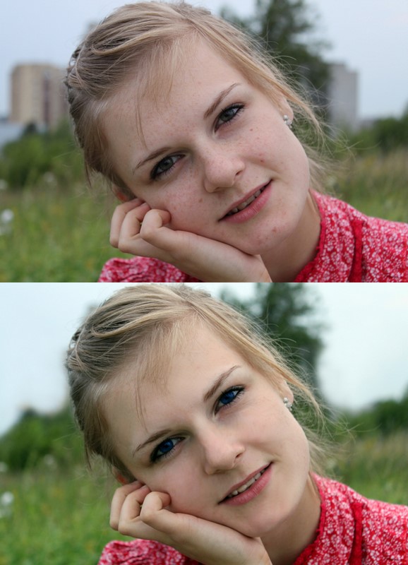 Pernelyg nušlifuotas veidas. Reikėjo palikti kiek strazdanų. Plaukų šešėliuose atsirado žalsvas atspalvis. Gamtos fonas - realistiškesnis su pastatais. Žaluma įgavo cheminį atspalvį.