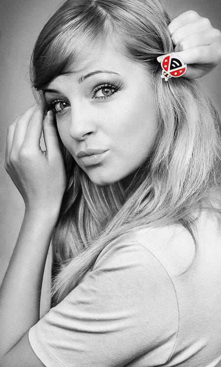 P.S. modelis simpatukė, tiek nepjaučiau jos vargšelės -ją daugiau norisi pamatyti, ir kažkaip nelimpa man tas boružės spalvinimas, gal geriau visą kadrą spalvotą palikti, nebent ji su tokios pat spalvos marškinėliais, kaip ir ta boružė, - bet tada vėl gi išeitis yra- nusimesti lauk tos marškinėlius.