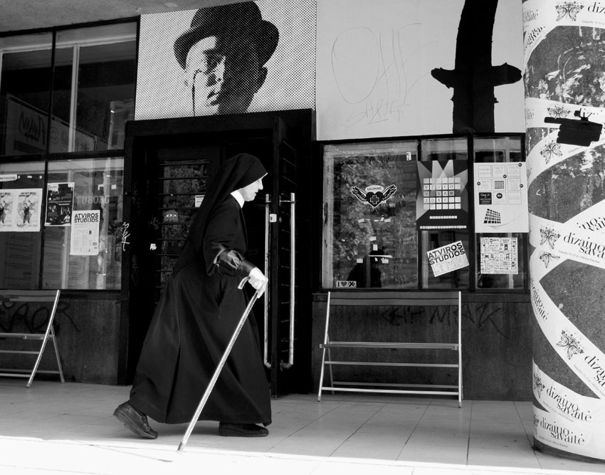 Gražiai pagautas vienuolės judesys, švytintys profilis ir ranka su lazdike. Ir kad chaosas aplink ++