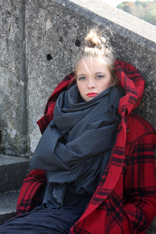 Atsivertus fotografija, akys nukrpysta i raudona palta, nes jis ryskus. Todel mergina lyg ir pranyksta siame "medziagos gabale", bet turetu buti atvirksciai, todel siulyciau atsvarai naudoti rysku akiu makiaza, juolab kad lupos yra raudonos. Arba j/b fotografija. :)