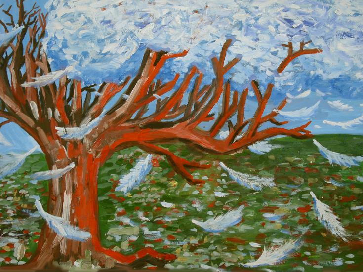 noretusi daugiau apacios ir virsaus.dabar kiek kompoziciskai suspausta gaunasi...o tos krentancios plunksnos labai patinka, spalvos taip pat