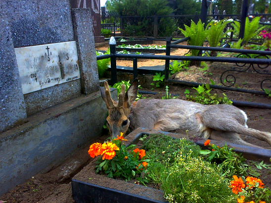 Pakomentuosiu situaciją, čia yra viskas realu. Buvo gautas pranešimas apie kapų teritorijoje esančią sužeistą stirną. Patikrinus pranešimą vietoje faktas pasitvirtino. Sužeistas stirninas(sulaužytu stuburu) prieglobstį rado ant nuotraukoje užfiksuoto kapo. Labai gaila, bet šio stirnino gyvybės išgelbėti nebepavyko.