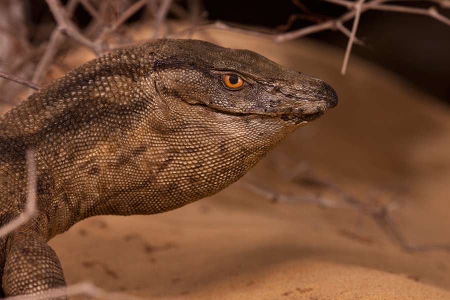 Varanas, smėlis, šypsena