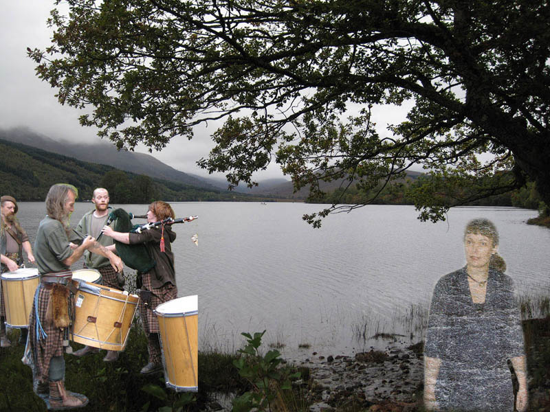 škotai ir moteris prie Arkaigo ežero.(koliažas)