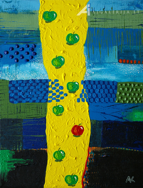 Mano akimis labai labai gražiai žaidi spalvomis, kaip ir visuose darbuose. Bet vat tokie pusiau realistiški obuoliai man šitam abstrakčiam darbe nesižiūri.... Ne obuolių spalva nesižiūri, o stilius, kaip jie nupiešti.