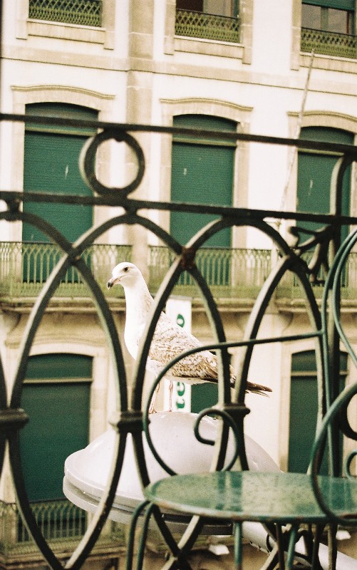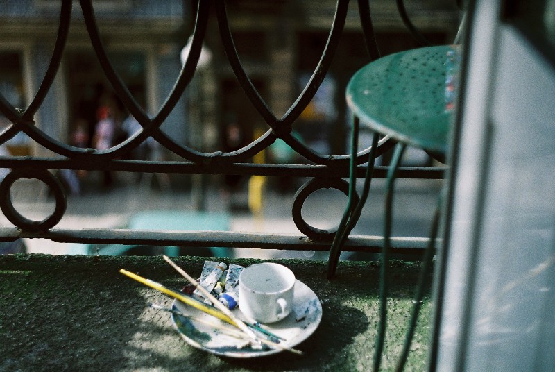 balkonas, dvi zuvedros ir dazai