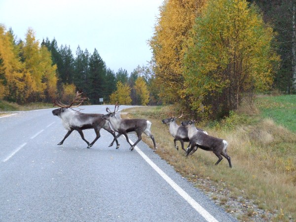 Prieš fotografuodamas, privažiavau arčiau ...tiesiog atspėjau ,kad jie perbėgs toje vietoje kelią .Švedai pasakojo,kad elniai laikomi panašiai kaip pas mumis karvės.Gyvena laisvai miškuose,atėjus šalčiams eina prie žmonių