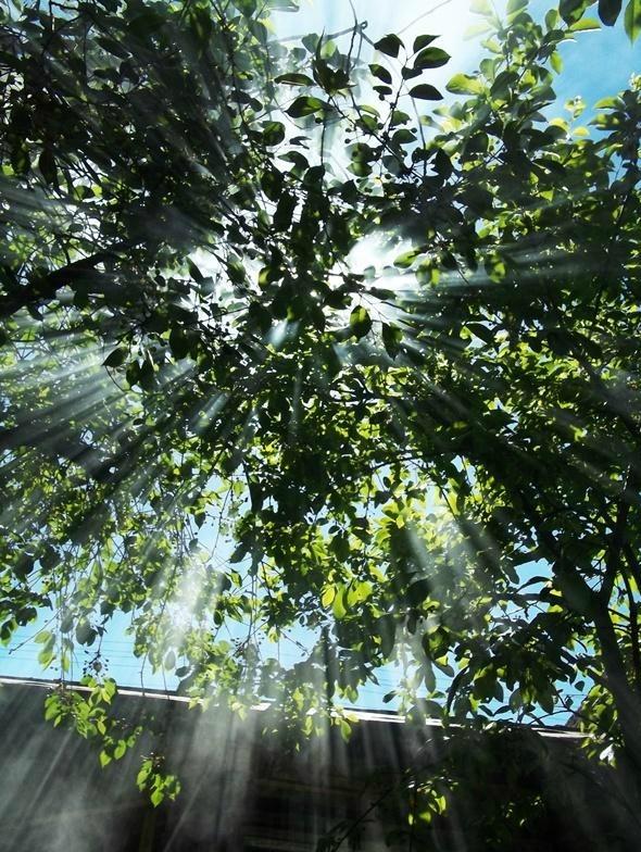 saulės spinduliai pasiklydę dūmuose.