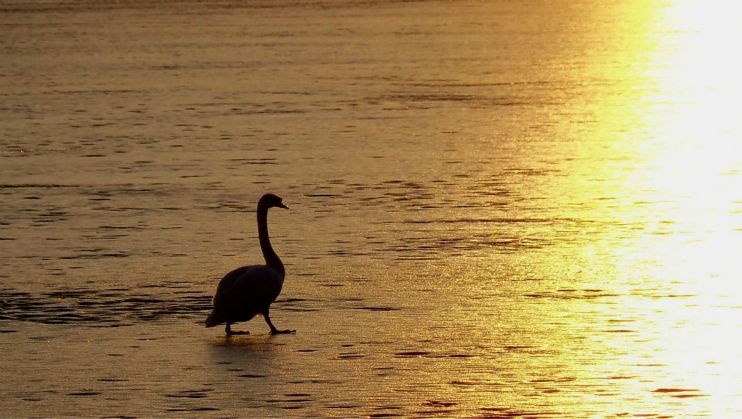 Gulbė ant ledo leidžiantis saulei