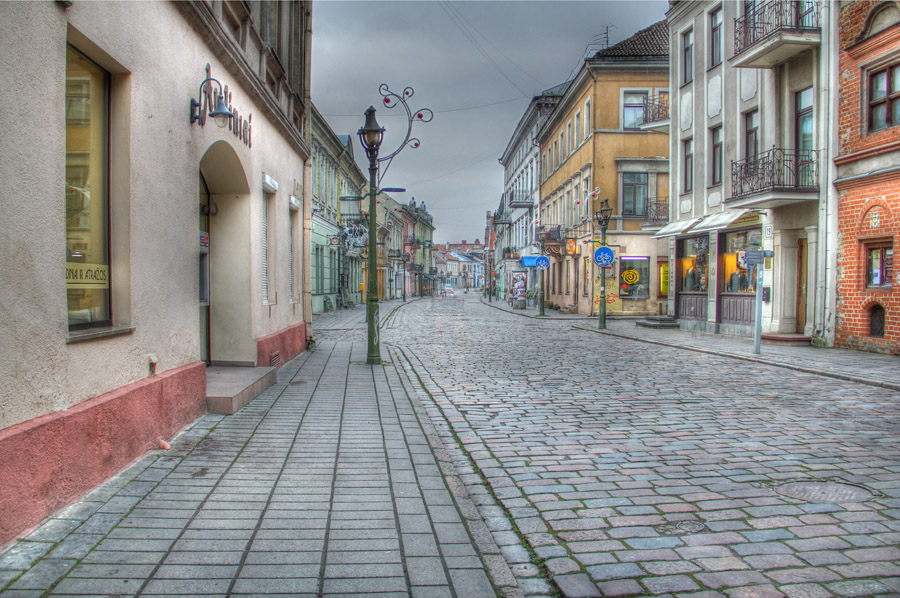 Patraukia kontrastai. Viena pagrindinių gatvių, o žmonių nėra, pilkas slegiantis dangus, o pastatai ir gatvė švyti.